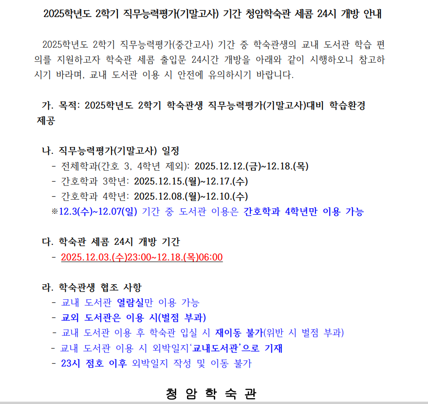 [학숙관생필독] 2025학년도 2학기 직무능력평가(기말고사) 기간 청암학숙관 세콤 24시 개방 안내