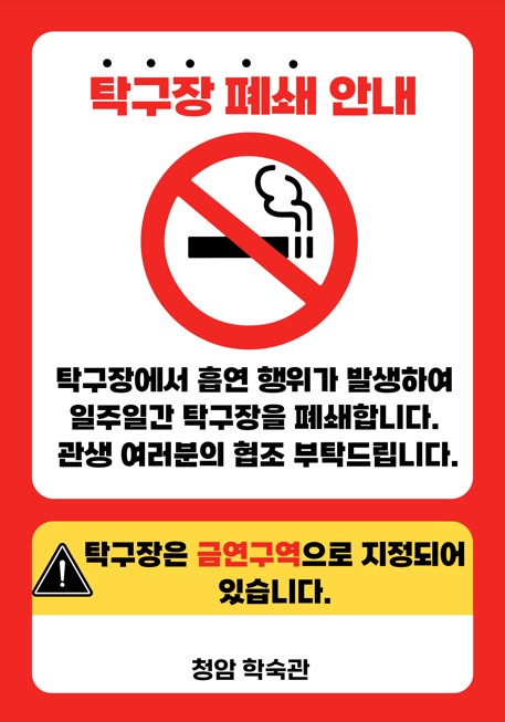 체력단련실(탁구장)흡연 행위 발생으로 인해 일주일간 폐쇄 안내