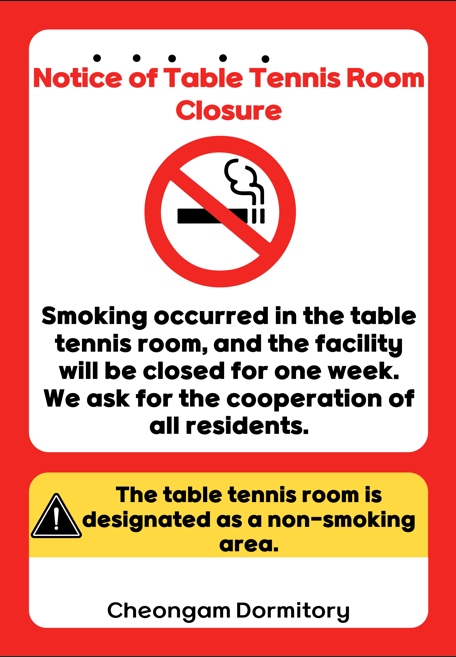 “Due to smoking that occurred in the fitness room (table tennis room), the facility will be closed for one week.”