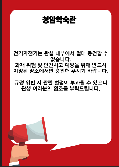 ● 화재 위험: 전기자전거 배터리는 과열·폭발 사고 사례가 많아 실내 충전 시 인명 피해 우려가 큽니다. ● 안전 기준 미충족: 일부 저가·불량 배터리의 경우 폭발 위험이 높습니다. ● 전기자전거 충전 장소: 학숙관 1층 행정실 앞(신고 후 충전) ☞ 관련문의: 학숙관 1층 행정실 740-7481~2
