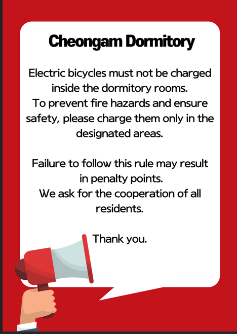● Designated Charging Area: In front of the Administration Office on the 1st floor of the dormitory (charging allowed after reporting).