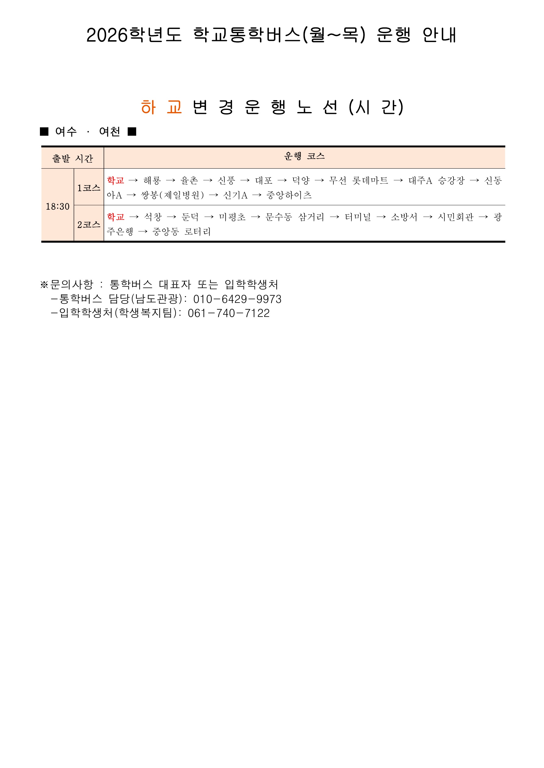 <h2>1. 변경하교노선 : 여수 여천 18시30분 1코스 2코스 분리운영</h2> <h2>2. 변경노선 운영시작일자 : 2026.3.30(월)부터</h2>