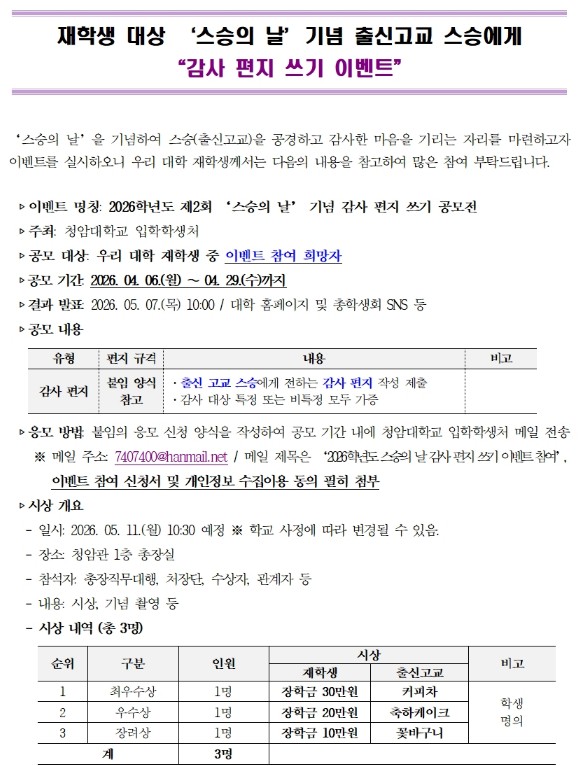 2026학년도 제2회 '스승의 날' 기념 출신고교 스승에게 "감사 편지 쓰기 이벤트" 안내