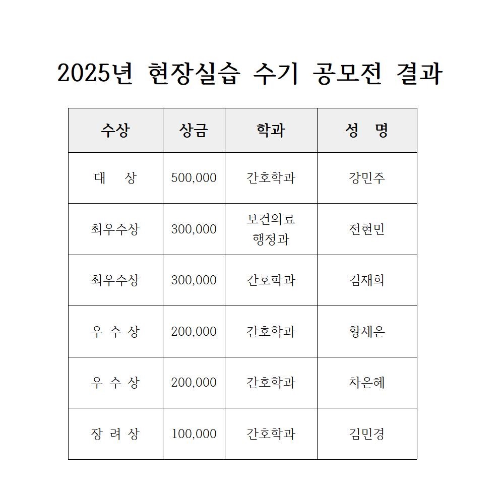 [2025학년도 현장실습지원센터 현장실습수기공모전] 에 참여해주신 재학생 여러분께 감사드리며, 수상자를 다음과 같이 발표합니다. - 문의사항: 현장실습지원센터 (☎061-740-7112) 앞으로도 현장실습지원센터의 프로그램에 많은 관심과 참여 부탁드립니다. 감사합니다.