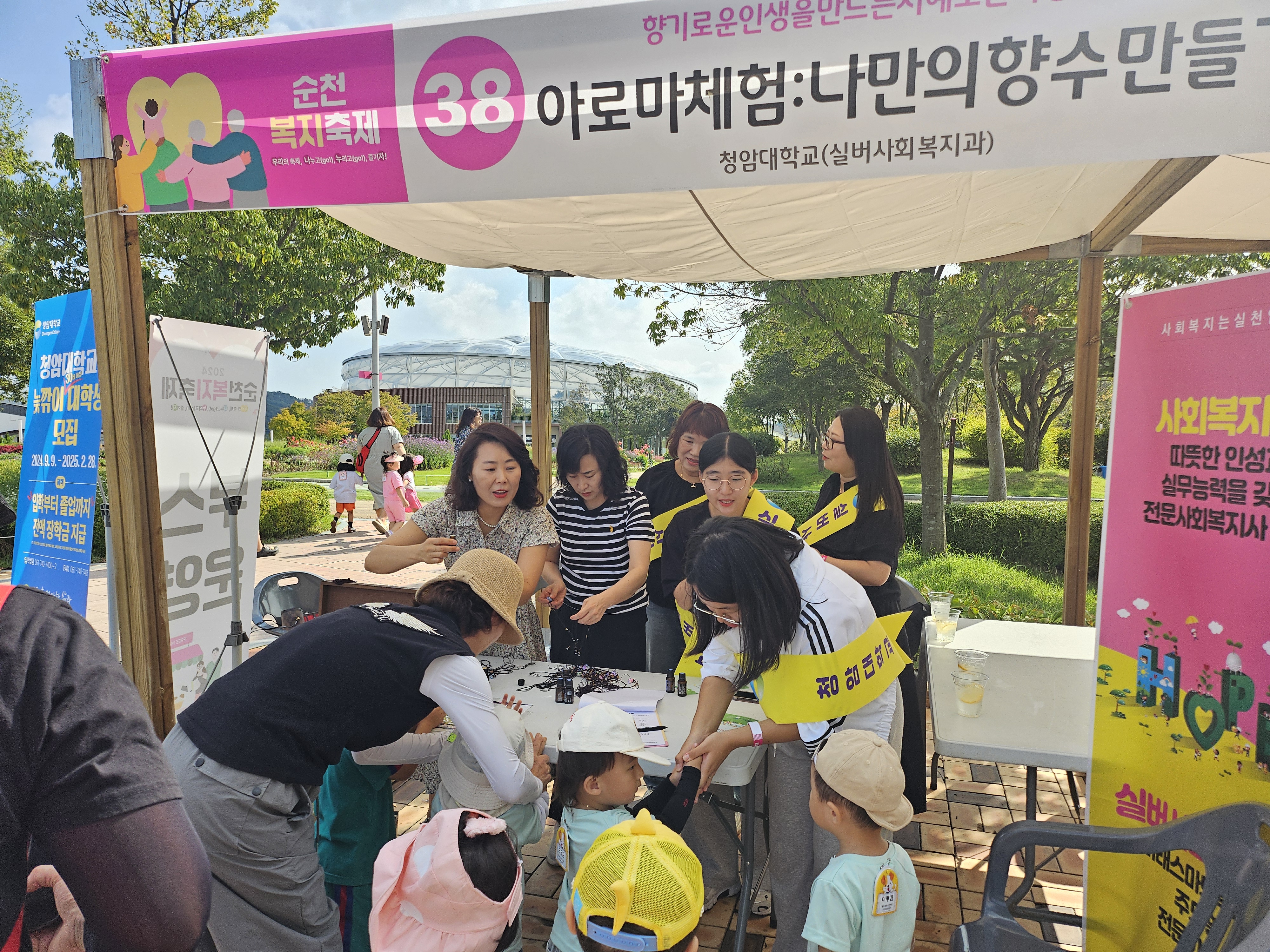 2024년 9월 27일 순천시복지축제에서 청암대학교 실버사회복지과 학생들은 ‘향기로운 인생을 만드는 지혜로운 이정표’라는 주제로 아로마 체험 부스를 운영하며, 지역주민들에게 치유와 휴식의 시간을 선사했습니다. 따뜻한 미소와 정성 어린 안내 속에서 학생들은 배운 지식을 현장에서 실천하며, 복지 인재로 성장해 가는 아름다운 모습을 보여주었습니다.