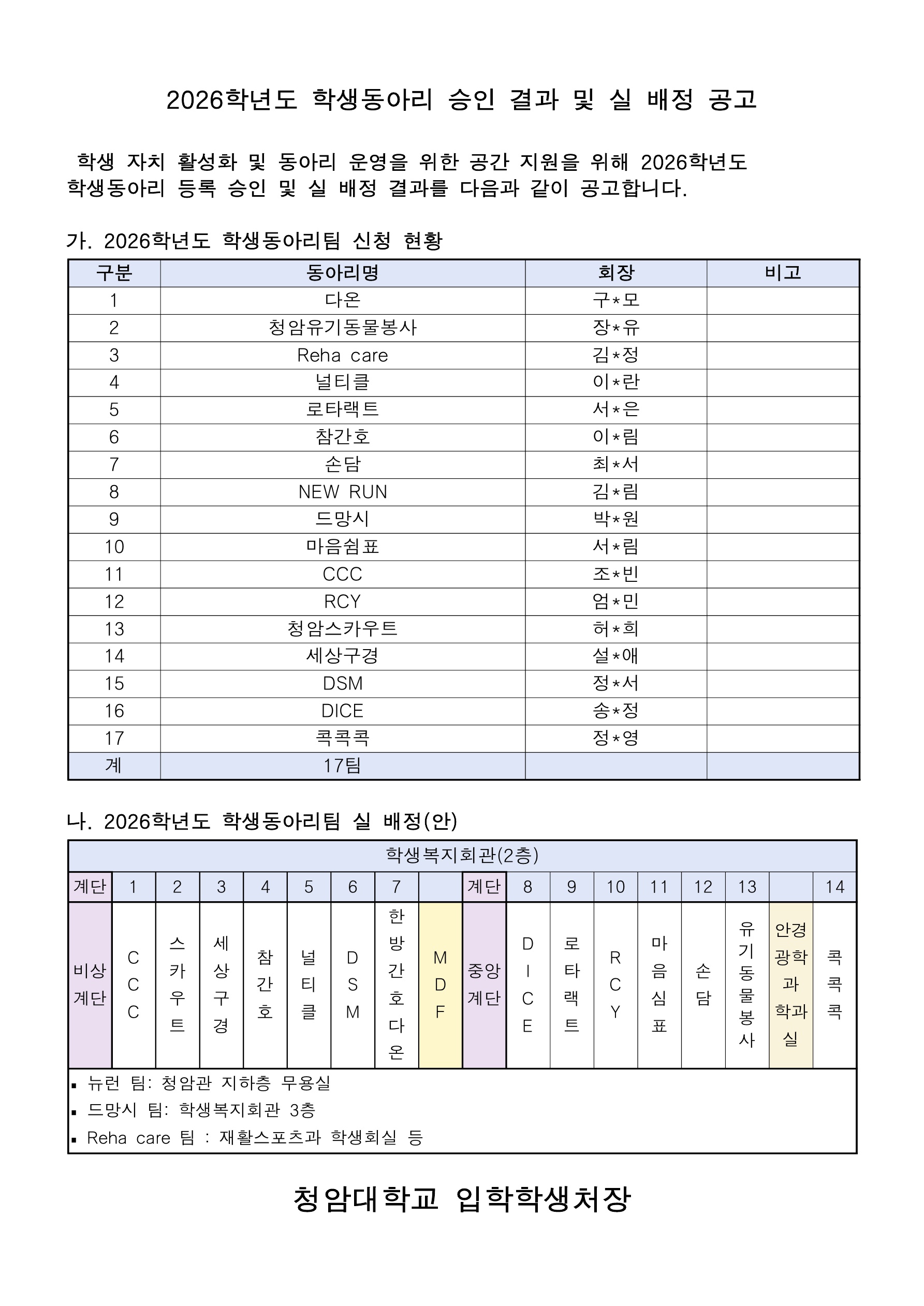2026학년도 학생동아리 승인 결과 및 실 배정 공고