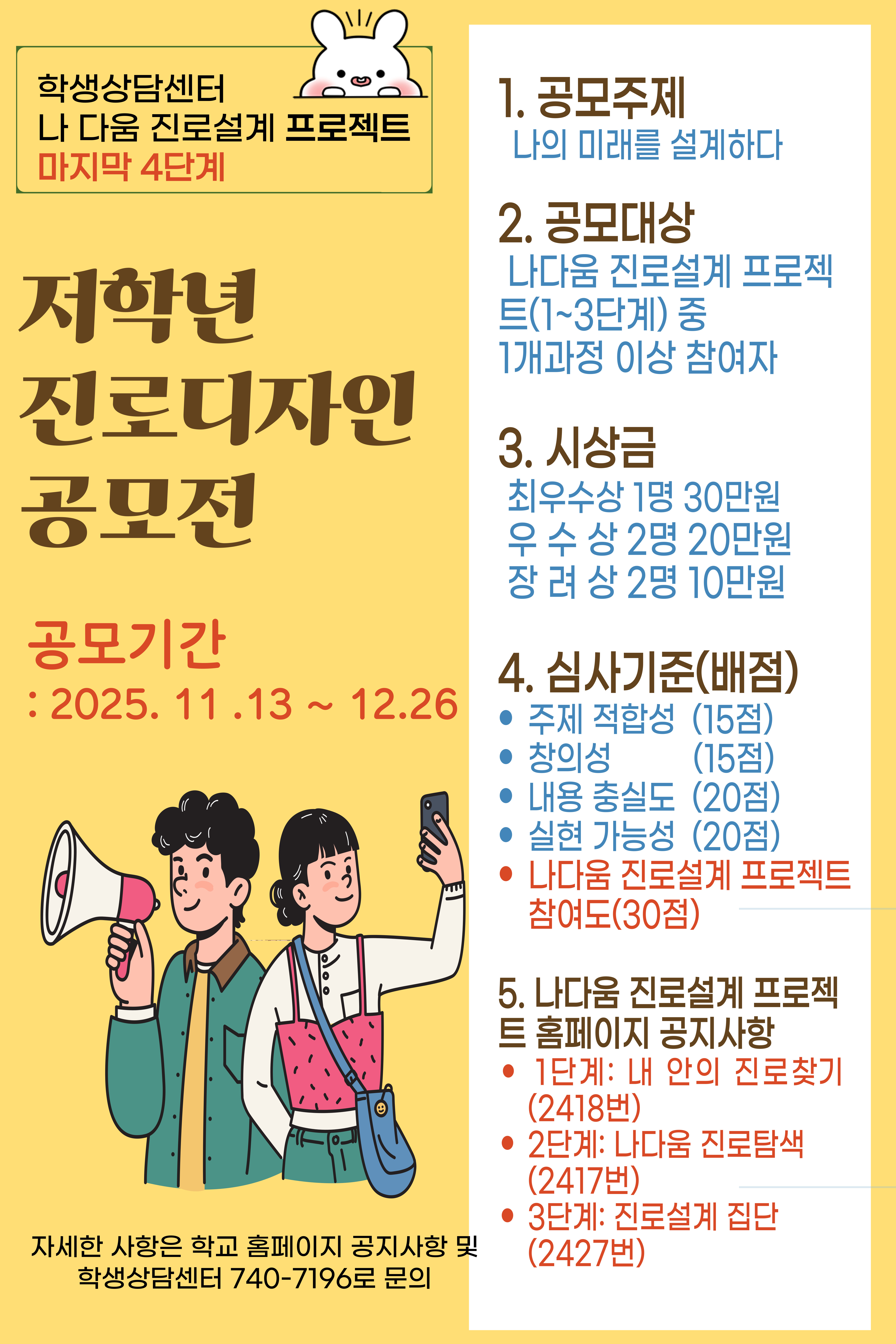 학생상담센터에서 저학년 대상 『저학년 진로디자인 공모전』를 실시하오니 학생들의 많은 관심바랍니다.