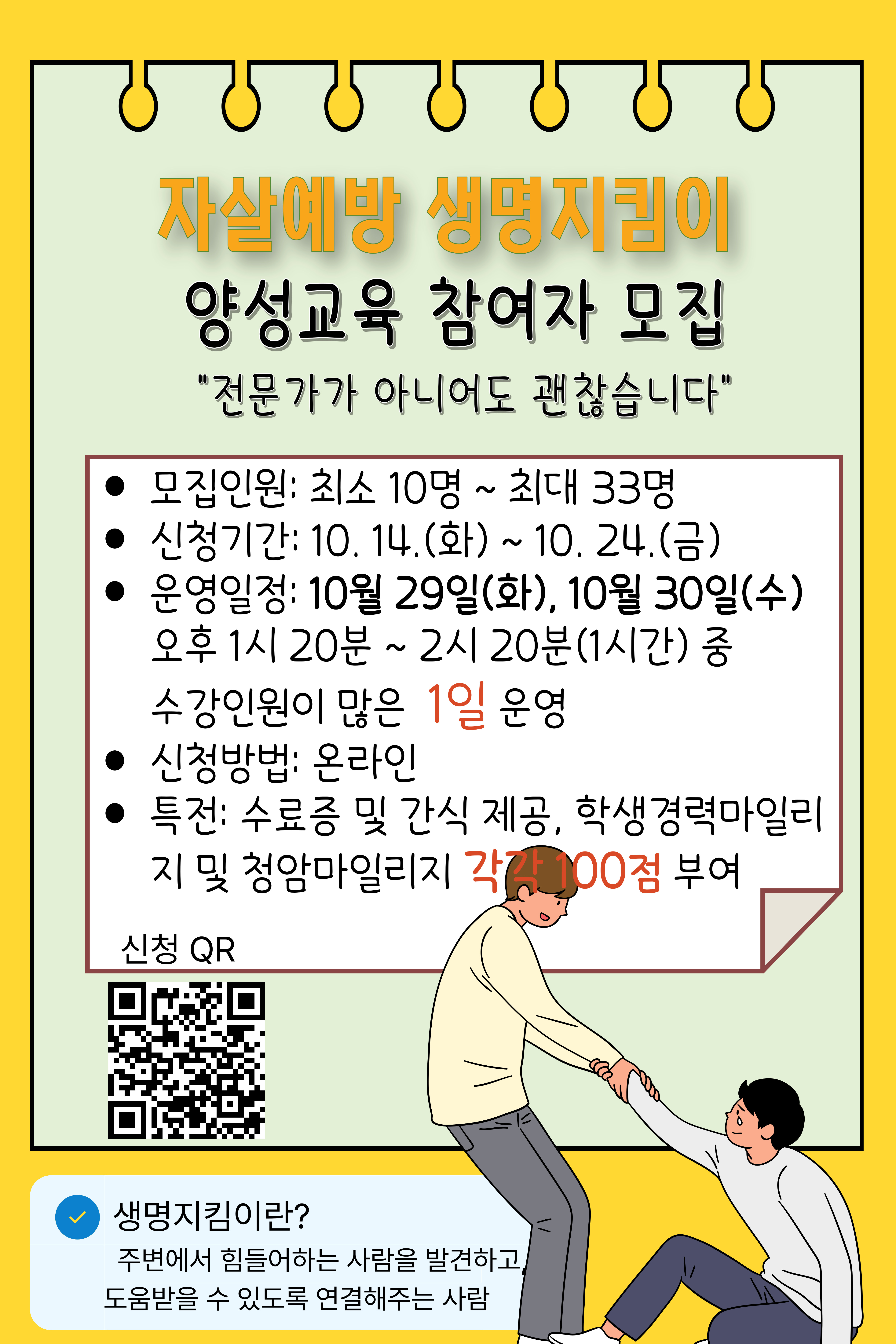 다음과 같이 자살예방 생명지킴이 양성교육을 진행하오니 학생들에게 홍보 부탁드립니다.