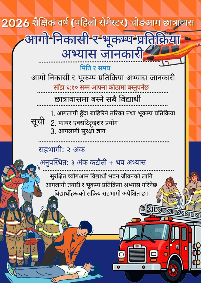 [आवासीय विद्यार्थीहरूका लागि अनिवार्य सूचना] २०२६ सालको पहिलो अर्धवार्षिक चुङआम छात्रावास अग्नि निकासी तथा भूकम्प प्रतिकार प्रशिक्षण सूचना