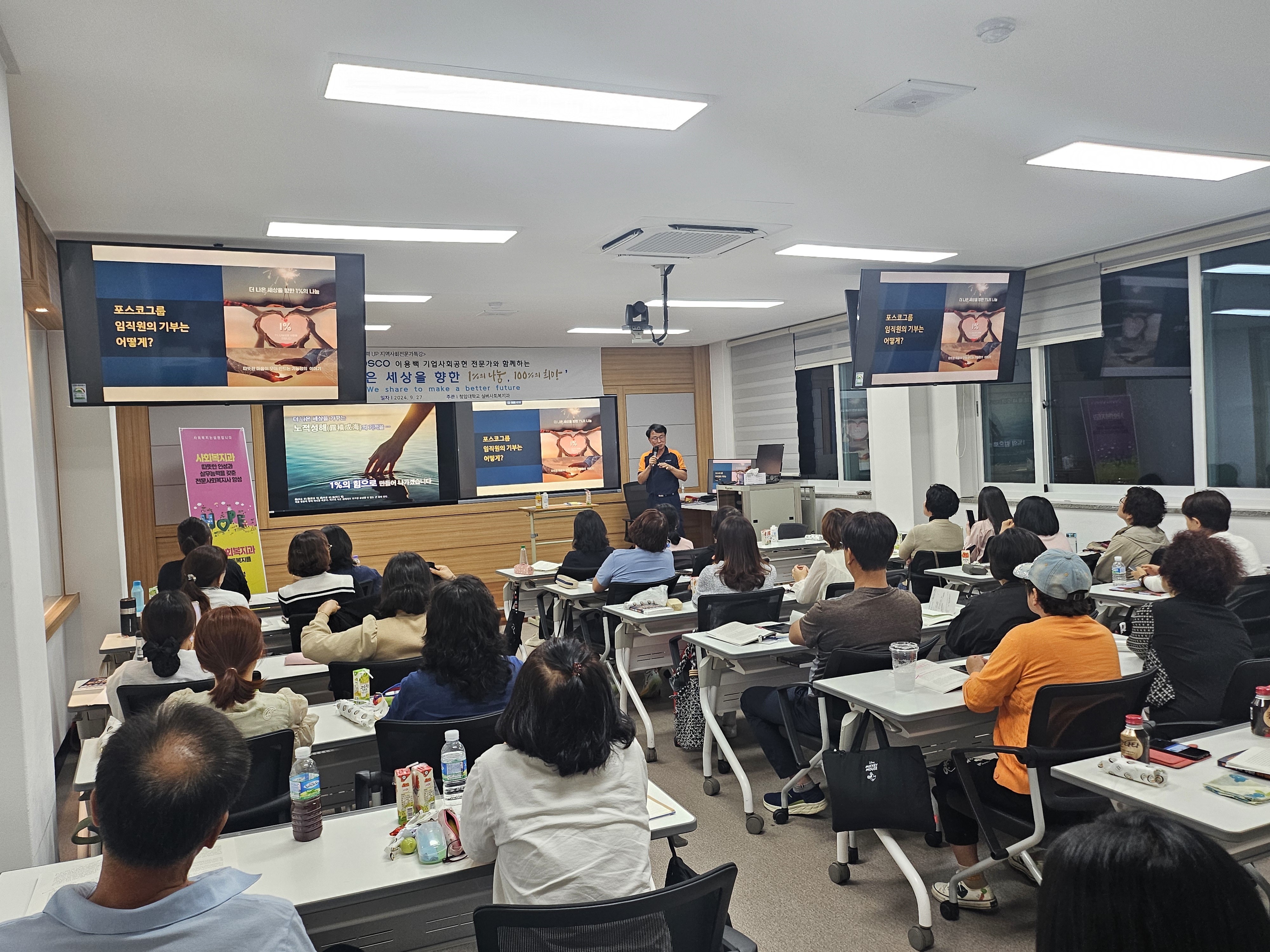 실버사회복지과는 2025년 9월 27일, ‘선한 영향력을 실천하는 기업의 사회공헌’을 주제로 POSCO 대외협력섹션 이용백 차장을 초청하여 특강을 진행했습니다. 기업의 사회공헌 사례를 통해 지역사회와 함께 성장하는 나눔의 가치를 배우며, 학생들은 예비 사회복지사로서 선한 영향력을 실천할 수 있는 비전과 동기를 다지는 의미 있는 시간이 되었습니다.