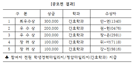 [2025학년도 학생상담센터 성장나눔 체험수기 공모전]에 참여해주신 재학생 여러분께 감사드리며, 수상자를 다음과 같이 발표합니다. - 공모전 시상식: 2025.12.3(수) 13:20 (*수상자는 시상식 필수 참여, 관련사항은 개별 안내 예정) - 문의사항: 학생상담센터 (☎061-740-7199) 앞으로도 학생상담센터의 프로그램에 많은 관심과 참여 부탁드립니다. 감사합니다.